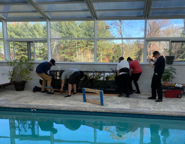 Carefully transporting the delicate custom made glass aquarium to its location by the pool.